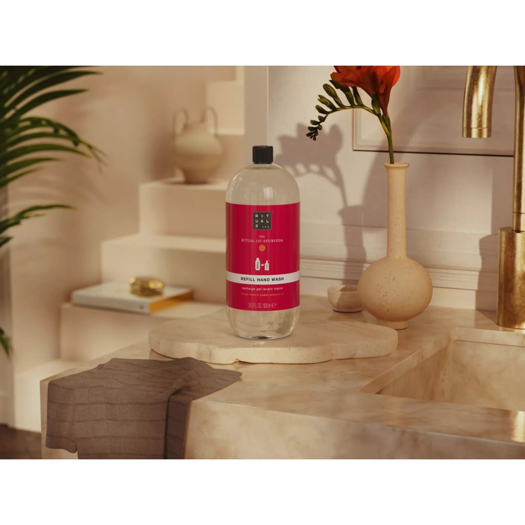 Je čas doplniť mydlo na ruky? S touto 600 ml náplňou môžete svoj dávkovač luxusného mydla na ruky Rituals naplniť dvakrát! Toto úžasné mydlo na ruky z radu The Ritual of Ayurveda, ktoré je navrhnuté tak, aby premenilo jednoduchú povinnosť na pokojnú chvíľu, je obohatené o sladký mandľový olej na dokonalé zjemnenie pokožky a upokojujúcu vôňu ruží. Naše mydlá na ruky majú neutrálne pH, takže sú šetrné k vašim rukám a zároveň ich dôkladne čistia.