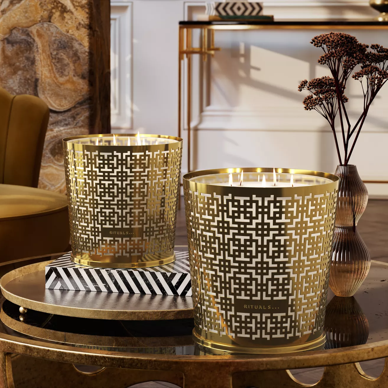Upokojte svoje zmysly aromatickou zmesou teplých drevitých tónov, pačuli a bohatého korenia s touto vonnou sviečkou Black Oudh v zlatom kovovom svietniku.