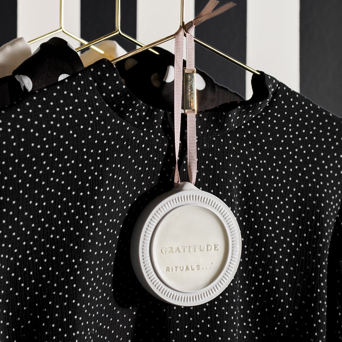 Prevoňajte svoj outfit očarujúcou zmesou broskyne, levandule a vanilky s touto vôňou do vášho šatníka. Túto vôňu, ktorá je aromatickým vyjadrením vďačnosti, vytvoril jeden z najlepších svetových parfumérov. Uzavretá v keramickom držiaku s očarujúcou stuhou a zlatým príveskom je ideálna na zastrčenie do zásuviek alebo zavesenie do skrine. S výdržou vône až 3 mesiace vnesie do vašich malých priestorov nádych pohodlia a elegancie.