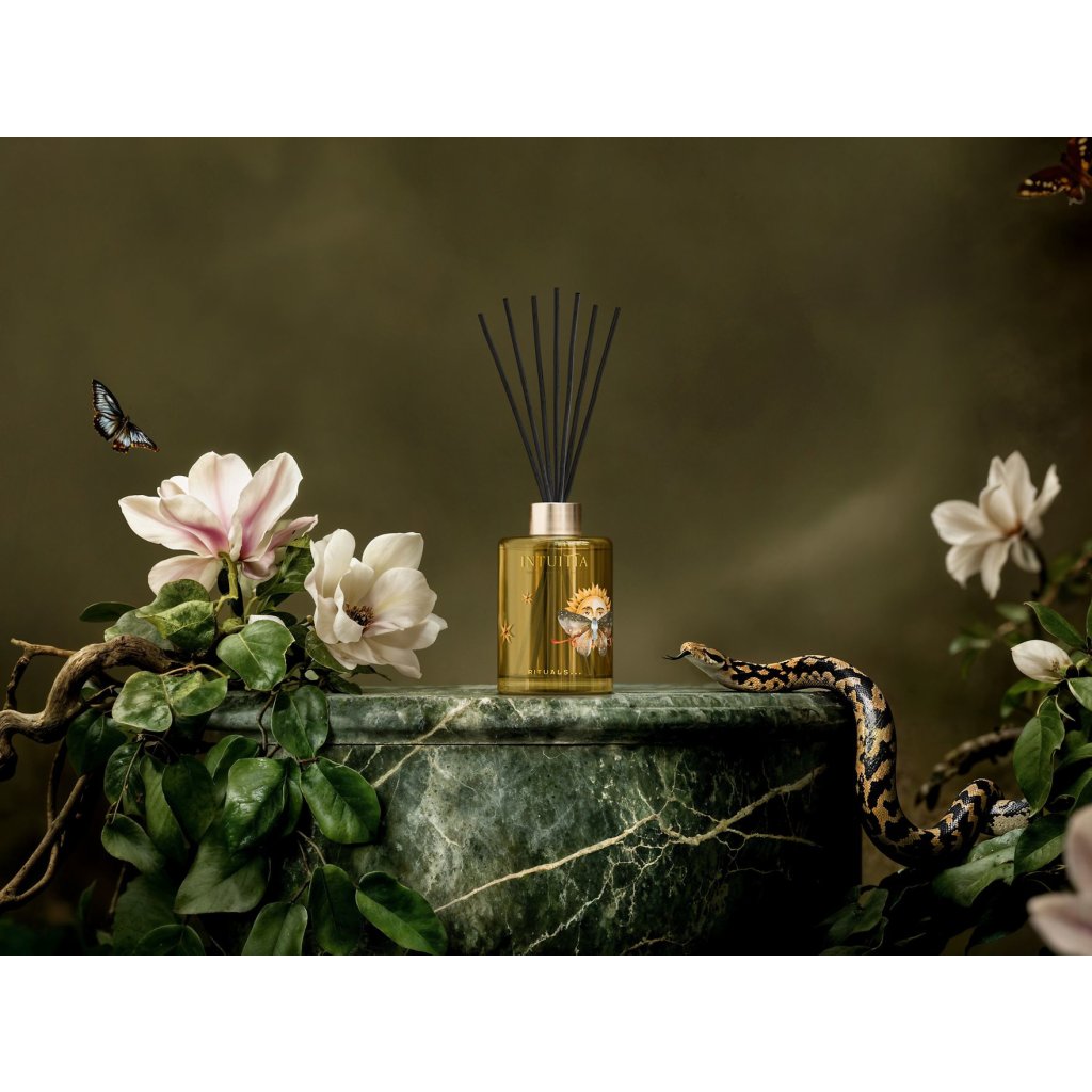 Doprajte svojmu domovu tieto luxusné vonné tyčinky z limitovanej edície, ktoré sú uložené v elegantnom zelenom sklenenom držiaku. Táto aromatická symfónia obsahuje hrejivosť šafranu, sladkosť vanilky a zemité santalové drevo. Tieto štýlové tyčinky, ktoré spolu vytvárajú príjemnú atmosféru, prevonia váš domov až na 3 mesiace.