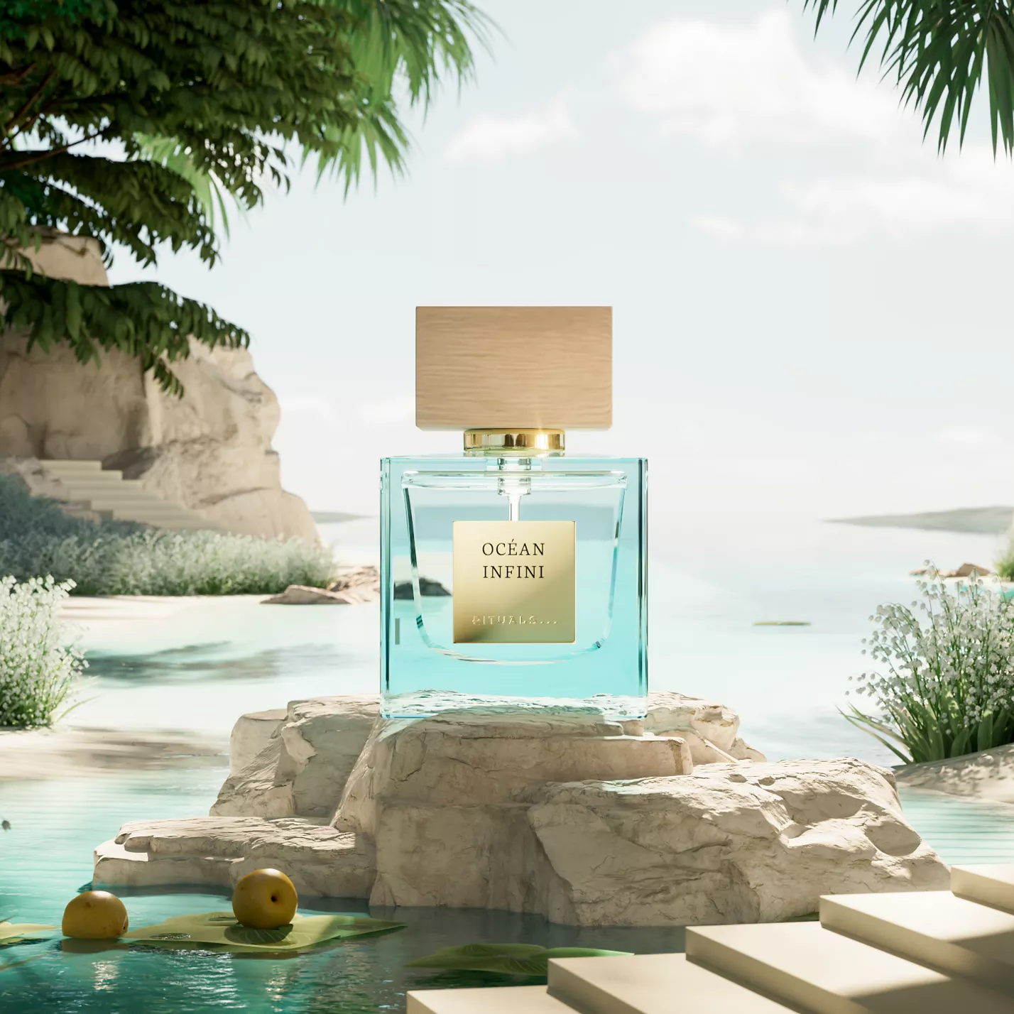 Vôňa Océan Infini je inšpirovaná vôňami krásneho Bali a spája sladkú vôňu jemných orosených vôd oceánu s osviežujúcimi ovocnými tónmi. Potešte svoje zmysly konvalinkou a hruškou nashi a povzbuďte svoju dušu teplom bieleho pižma. Táto sugestívna vôňa patrí do skupiny sviežich vôní a obsahuje 85,3 % zložiek prírodného pôvodu. Všetky naše elegantné flakóny na parfumy sú úplne rozložené, takže sú 100 % recyklovateľné.