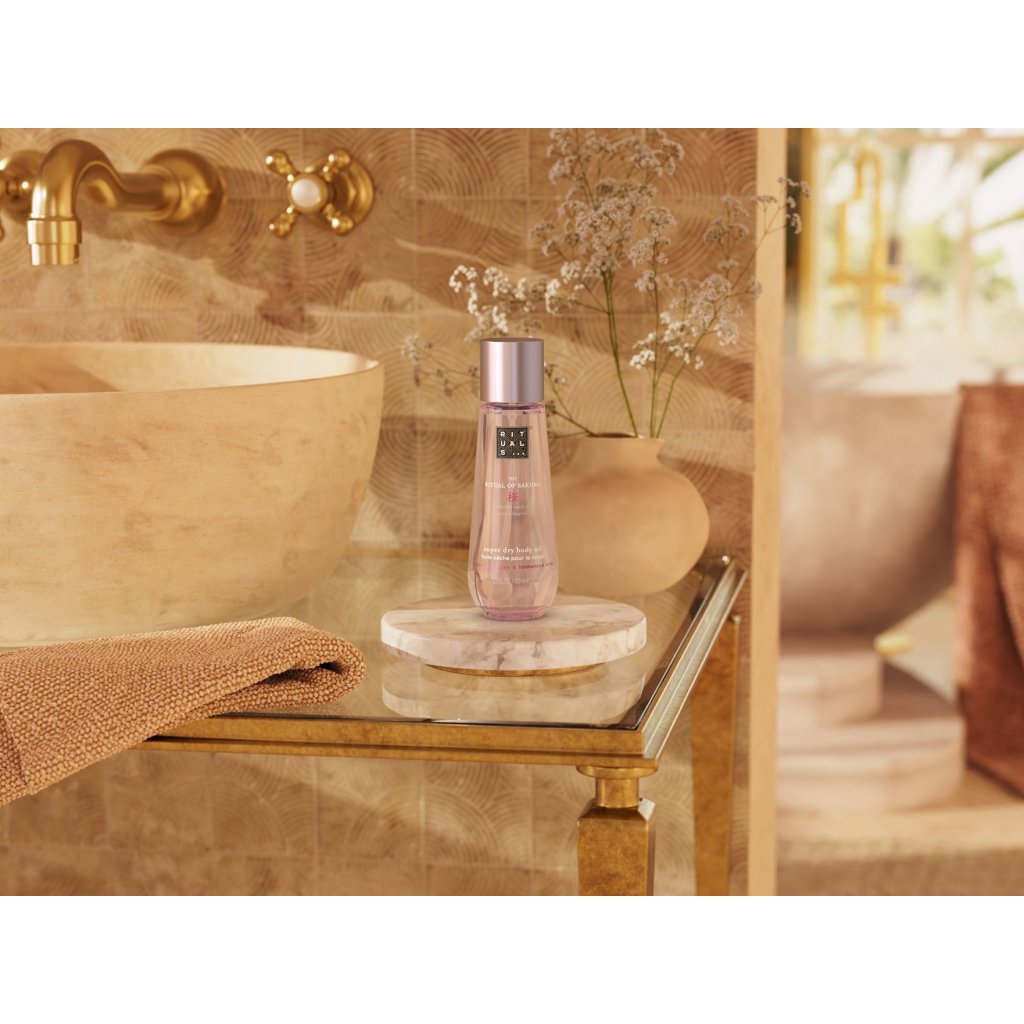 So suchým telovým olejom The Ritual of Sakura bude každý deň ako nový začiatok. Tento rýchlo sa vstrebávajúci suchý olej obsahuje výnimočne bohaté vyživujúce oleje, ktoré zanechajú vašu pokožku rozjasnenú a vyživenú. Ak máte suchú a mdlú pokožku, tento suchý olej pôsobí hydratačne a vyhladzuje štruktúru vašej pokožky pre jej žiarivý vzhľad. Charakteristická kombinácia elegantného čerešňového kvetu a jemného ryžového mlieka v tejto kolekcii vytvára omladzujúci voňavý zmyslový zážitok. Obsahuje 96 % zložiek prírodného pôvodu.