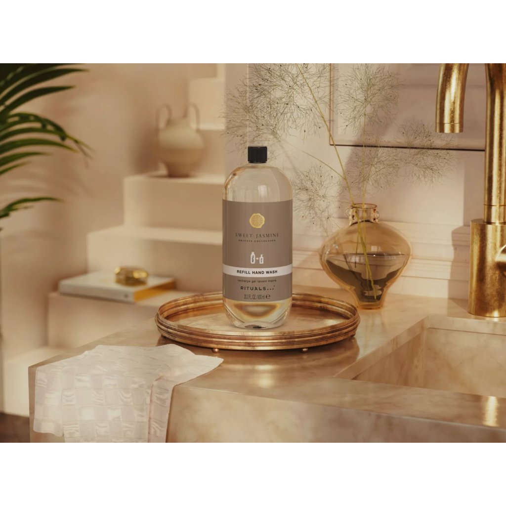 Je čas doplniť mydlo na ruky? S touto 600 ml náplňou môžete svoj dávkovač luxusného mydla na ruky Rituals naplniť dvakrát! Naša vôňa Sweet Jasmine zo súkromnej kolekcie, ktorá je navrhnutá tak, aby premenila jednoduchú povinnosť na pokojný okamih, sa otvára iskrivými tónmi citrusov a bobúľ, ktoré prechádzajú do elegantných kvetov, ako sú pivonka a konvalinka, a končí sa teplým santalovým drevom. Naše mydlá na ruky majú neutrálne pH, takže sú šetrné k vašim rukám a zároveň ich dôkladne čistia.