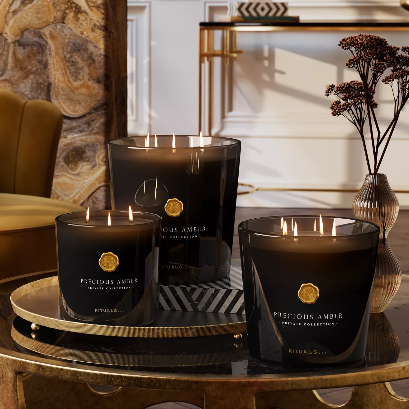 Ponorte sa do sladkej a zmyselnej vône našej luxusnej sviečky s tromi prútikmi, ktorá je voňavou kombináciou bohatého ylang ylang, pačuli, vetiveru a vzácneho jantáru.